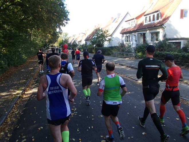 Horner Heerstraße Leher Herrstraße 11.30 Uhr / Km 22,6 Ich blieb bei Toni in der jetzt hinteren Gruppe. Das ergab sich einfach. Der Plan war, so lange wie bei Toni am Ballon zu kleben, also machte ich das. |