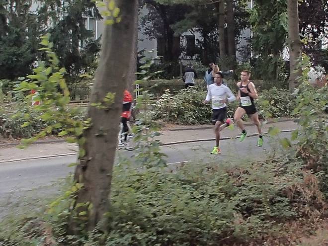 Parkallee 11.52 Uhr / Km 26,9 Die beiden Führenden des Halbmarathon-Feld auf der Gegenseite. Die hatten aber noch 1,6 Kilometer Rückstand auf unsere Ballon-Gruppe. |
