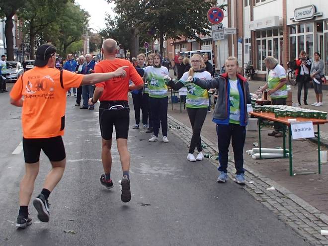 Berufsbildungswerk Bremen 11.36 Uhr / Km 23,6 Etwas früher als erhofft kam der nächste Getränkestand. Nachdem ich nun seit 13,6 Kilometern nichts mehr zu trinken hatte, kippte ich hier gleich zwei Becher. |