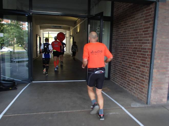 Speicher 1 12.21 Uhr / Km 32,9 Der Lauf mitten durch den Speicher 1 gehörte schon 2009 zur Marathon-Strecke. Dabei könnte man ohne einen Mehr-Meter auch vor oder hinter dem Speicher vorbei laufen, aber so ist es kultiger. |