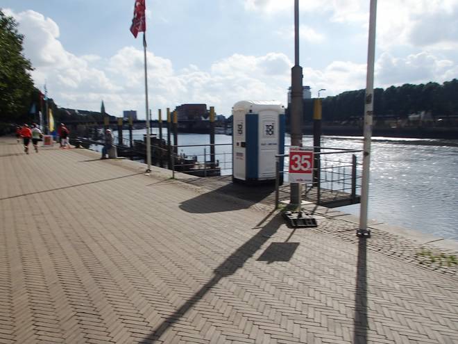 Weserpromenade 12.33 Uhr / Km 35,2 Jetzt wurde es schwer. Der linke Fuß tat immer mehr weh. Normalerweise hätte ich ja längst angehalten, um etwas verarzten, aber ich hatte keine Zeit mehr zu verlieren. |