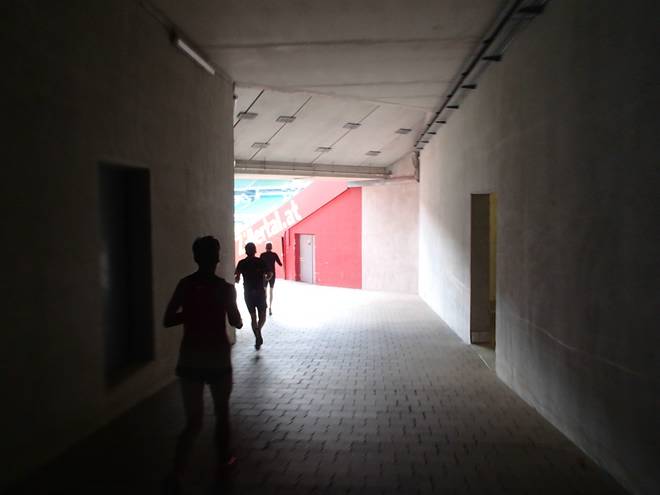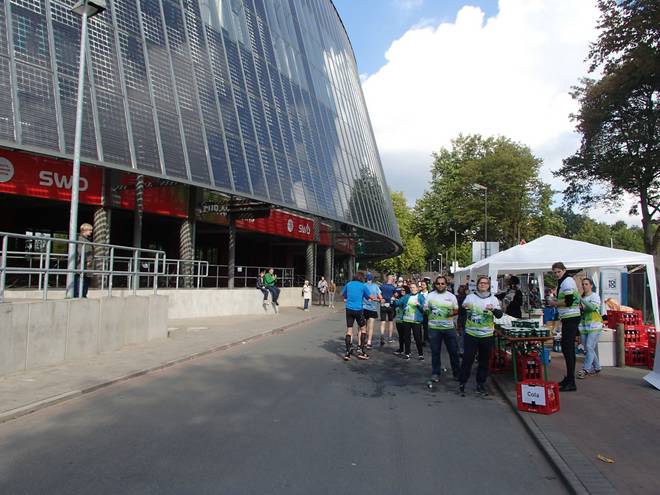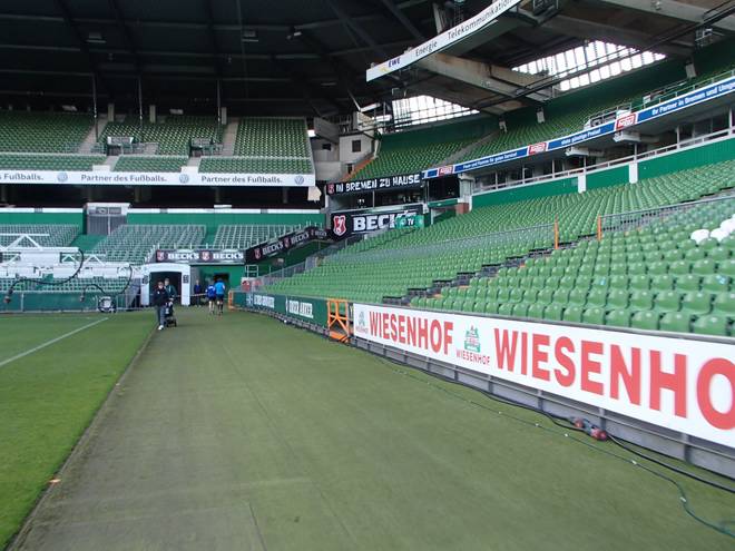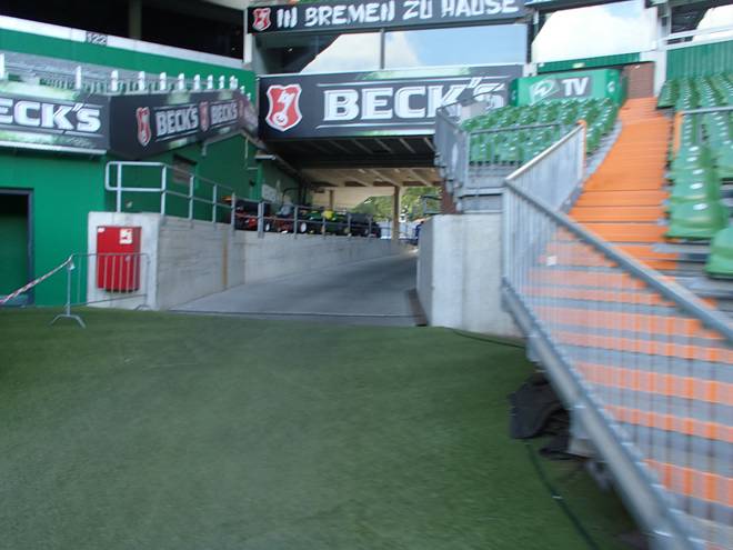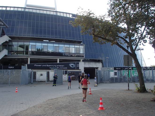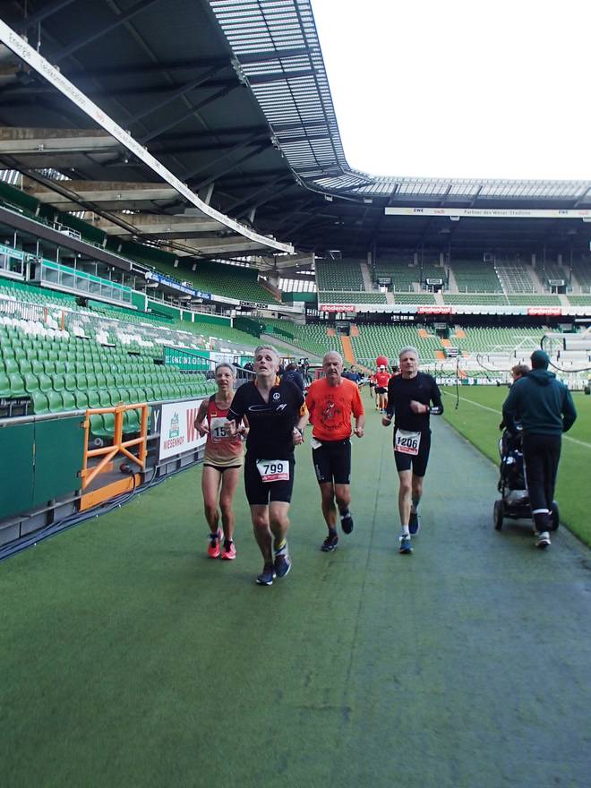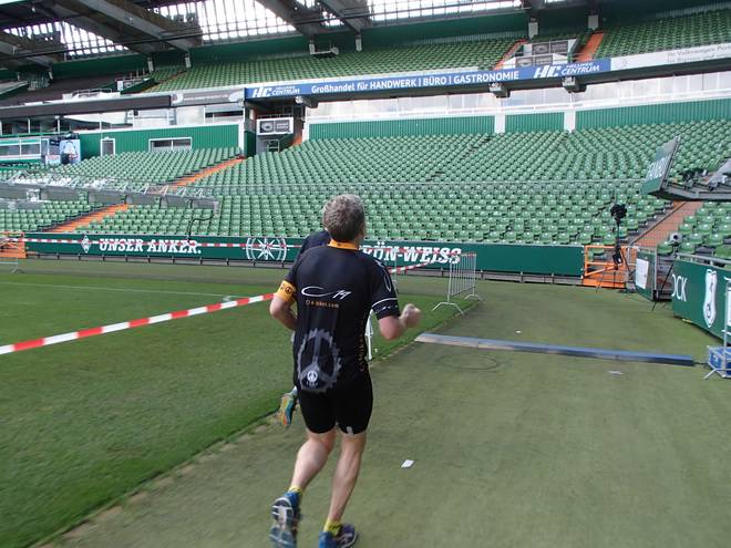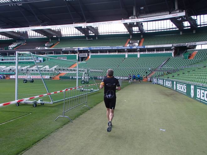 Weserstadion 12.50 Uhr / Km 38,4 Vermutlich wäre ich gar nicht mehr von der Trainerbank wieder hoch gekommen. |