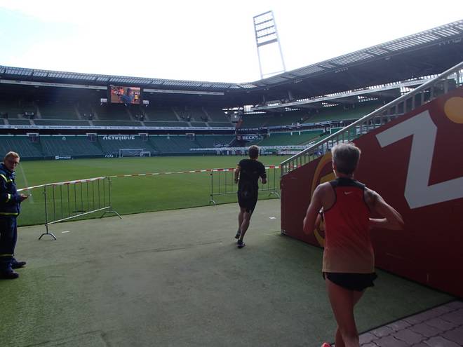Weserstadion 12.49 Uhr / Km 38,2 Das Durchqueren des Stadions ist absolute das Highlight des Marathons. |
