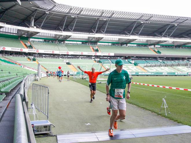 Weserstadion 12.49 Uhr / Km 38,3 Wer tatsächlich mal einen Lauf Im Weserstadion finishen will, der sollte mal beim B2RUN reingucken. 2016 konnte man hier finishen. |