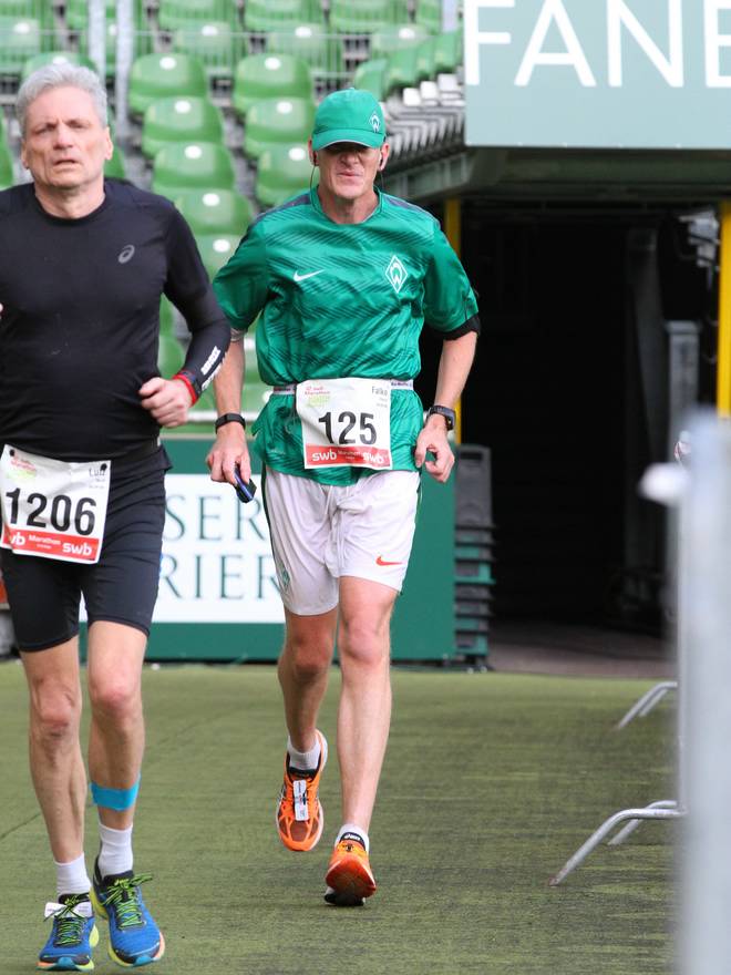 Weserstadion 12.49 Uhr / Km 38,3 Na, da hatte ich doch genau das richtige Trikot für den Stadion-Lauf an. Es ist aber auch so das einzig wahre Trikot. Foto: Aron Kankel |