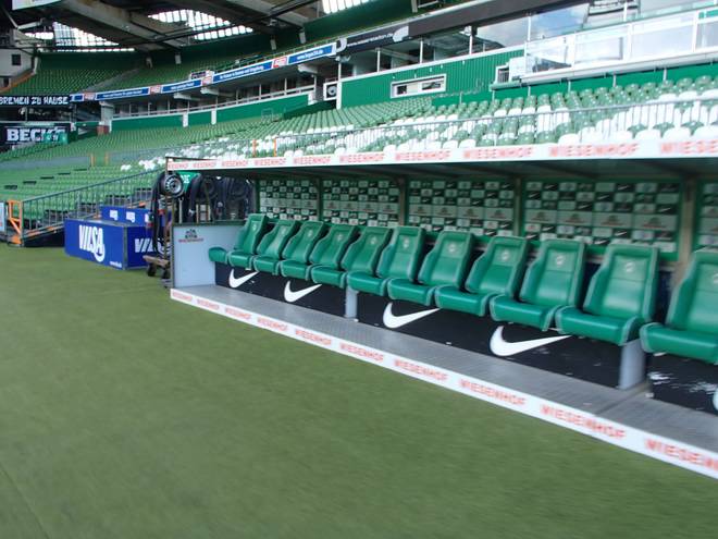 Weserstadion 12.50 Uhr / Km 38,4 Vor dem Lauf hatte mir jemand erzählt, man könne sich auch auf die Trainerbank setzen und sich fotografieren lassen. Prima Idee, aber irgendwie war gerade kein Fotograf in Sicht und Zeit hatte ich auch nicht. |