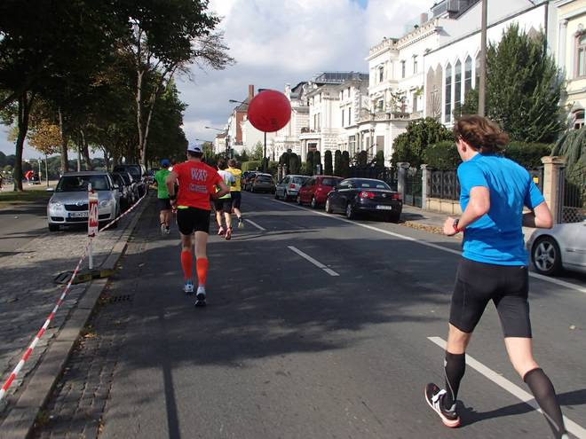 Am Kaffee-Quartier 12.26 Uhr / Km 33,8 Warum ich auf die Idee kam, dem Ballon-Läufer davon zu laufen? Gute Frage. Wohl eine Panikreaktion. Ich wollte nicht hinter dem Ballon mehr und mehr Sekunden verlieren. Nun machte ich also, was ich sonst auch immer tat. Ab nach vorne und mal sehen, was da so ginge. |