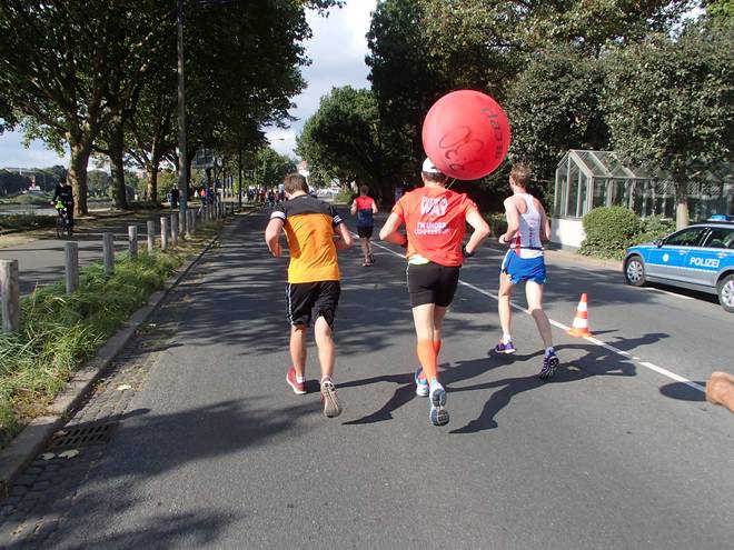 Weserpromenade 12.48 Uhr / Km 38,0 Und wieder waren ein paar Sekunden weg. Genau hatte ich nicht hingeguckt. Da lief und lief und lief ich und mühte mich ab, aber das Tempo stimmte nicht mehr. Andererseits hatte mich Heinz mit dem Ballon noch nicht wieder eingeholt. |