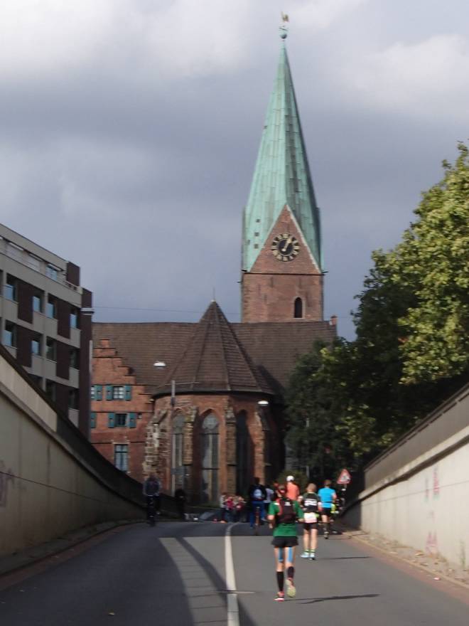 Martinistraße 13.04 Uhr / Km 41,2 Die Steigung raus aus der Unterführung mußte noch bewältigt werden, aber da wurde ich von My Chemical Romance hoch gepowert. Voraus die Martini Kirche. Da war sie wieder. Nur noch ein Kilometer. So wie ich es kurz nach dem Start schon gesagt hatte. |