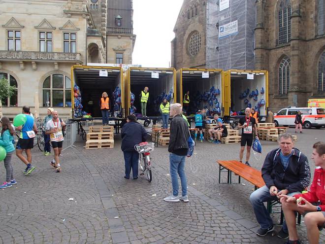 Domshof 13.15 Uhr Ich ging so langsam, daß die Dame im Kleider-LKW (hier steht sie noch an der Rampe) meine Startnummer sehen, meine Tasche finden und mir entgegen bringen konnte, noch bevor ich das Ende der Bank hier rechts erreicht hatte. |