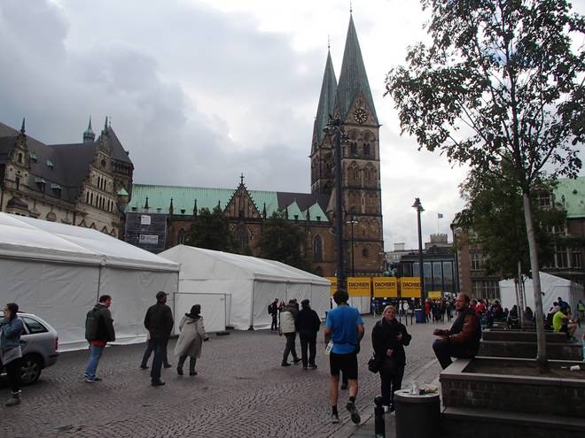 Unser Lieben Frauen Kirchhof 13.09 Uhr / Km 42,1 Noch einmal unter die 3:30 Stunden. Gerannt. Gekämpft. Für mich. Für Bremen. Für den SV Werder. Für die Ehre. Und gewonnen. Foto: Nils |