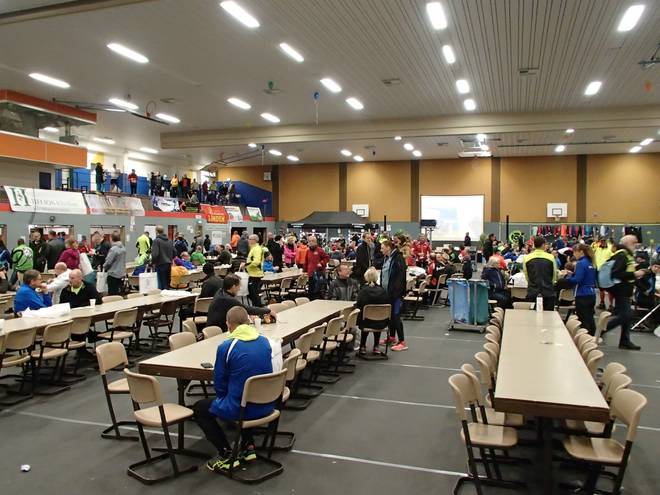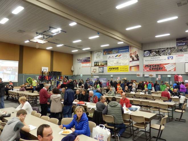 Sportzentrum Hackenberg 16.47 Uhr Eine Etage tiefer fand dann die Pasta-Party statt. Kostete zwar € 4,50 pro Protion (oder € 6,50 mit Getränk), war aber sehr lecker. |
