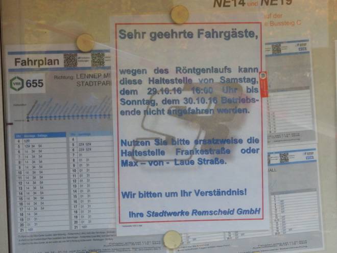 H2O Sauna- und Badeparadies 17.03 Uhr Ganz so einfach war die Fahrt nach Lennep dann doch nicht. Daß die Haltestelle wahrend des Laufes Sonntag nicht mehr angefahren werden konnte, machte Sinn. Aber warum auch am Samstag? |