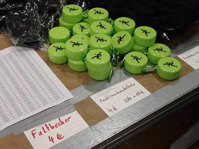 Sportzentrum Hackenberg 7.32 Uhr Die grünen Dosen beinhalten einen Faltbecher. Der Kauf wurde Ultra-Läufern wärmsten empfohlen, da es ab Kilometer 42 keine Becher mehr an den Verpflegungsständen geben sollte. Stand angeblich auch in der Ausschreibung, konnte sich aber keiner dran erinnern. Die Drohung "kein Becher, keine Getränke" ließ mich auch so einen Faltbecher kaufen. Und ich nahm ihn später auch mit auf die Strecke. |