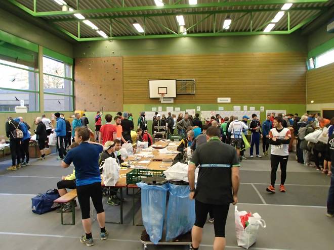 Sportzentrum Hackenberg 7.26 Uhr Bis zum Start war noch etwas Zeit, da ging ich lieber nach drinnen. 4°C waren es. 12°C würden es im Laufe des Tages noch werden. Allerbestes Wetter zum Laufen. Nur eben noch etwas zu kühl, um draußen herum zu stehen. |