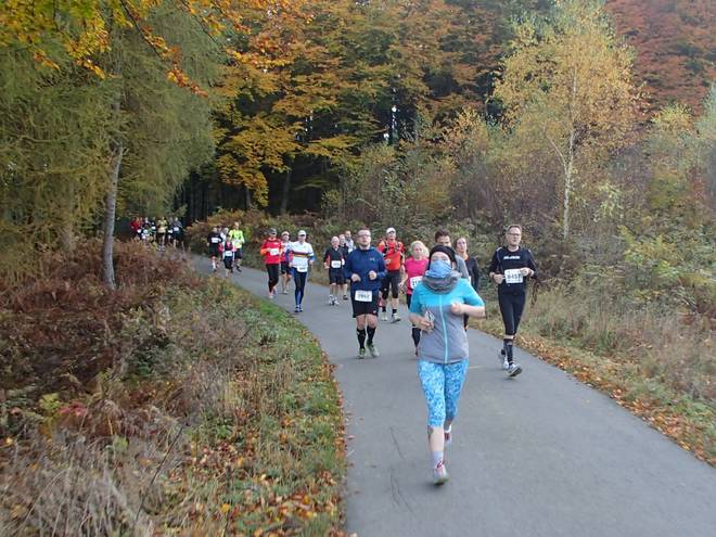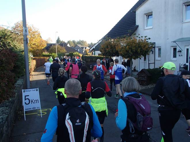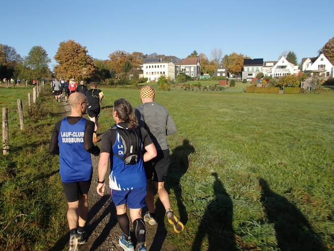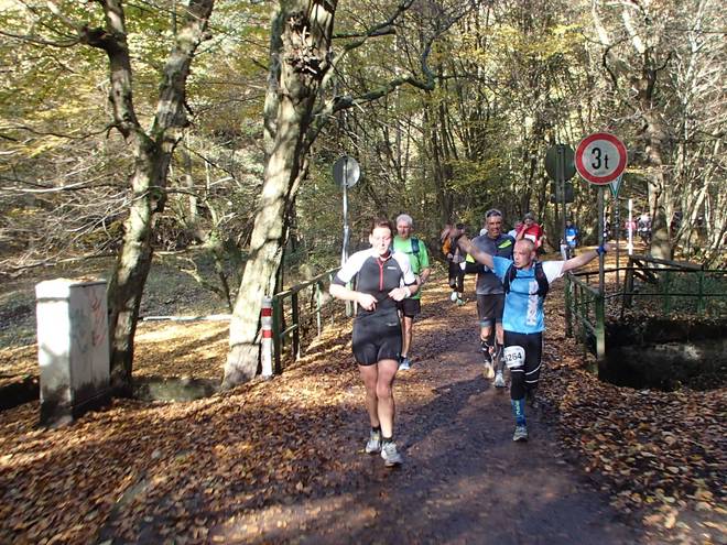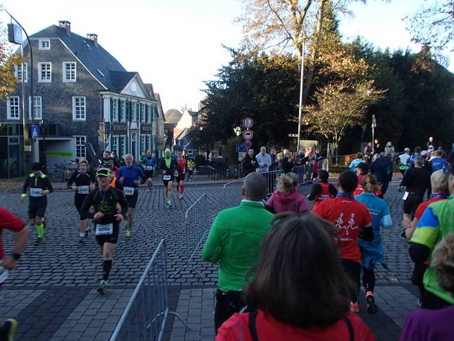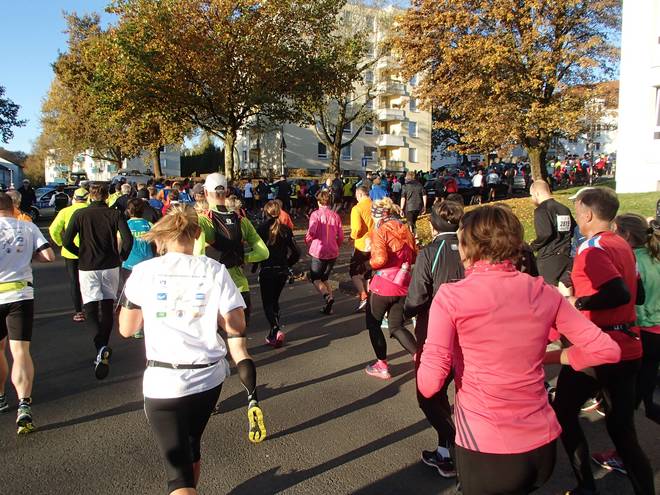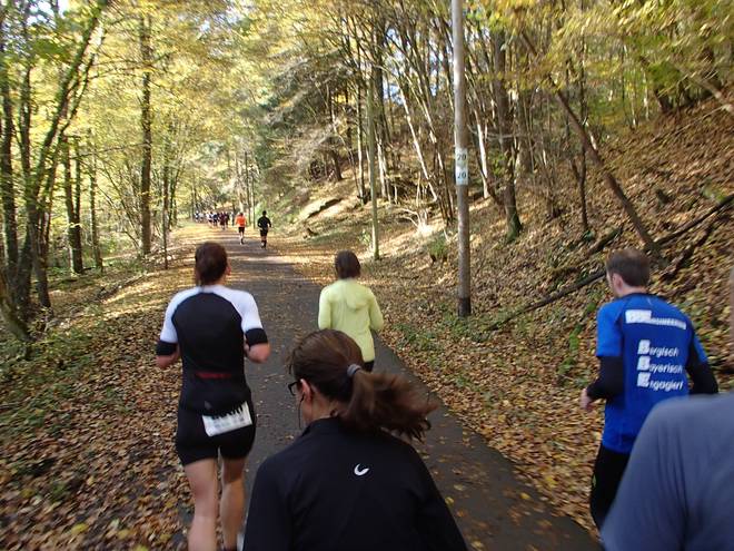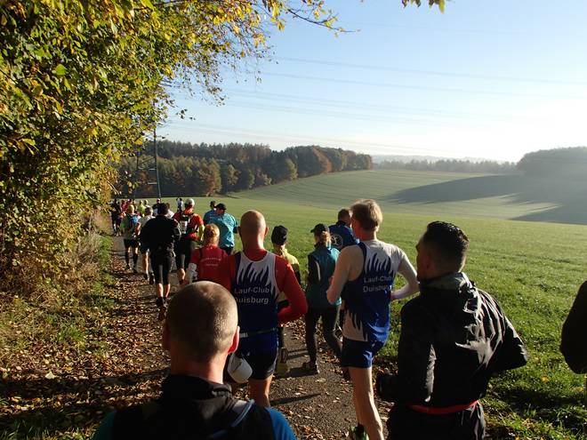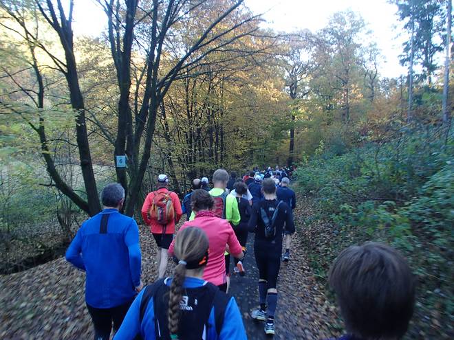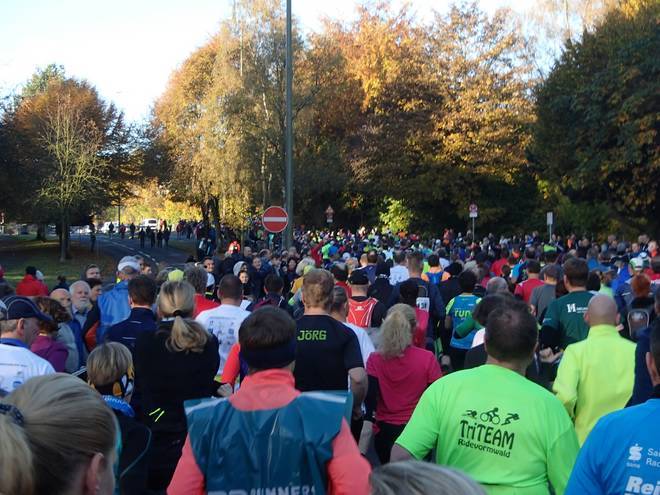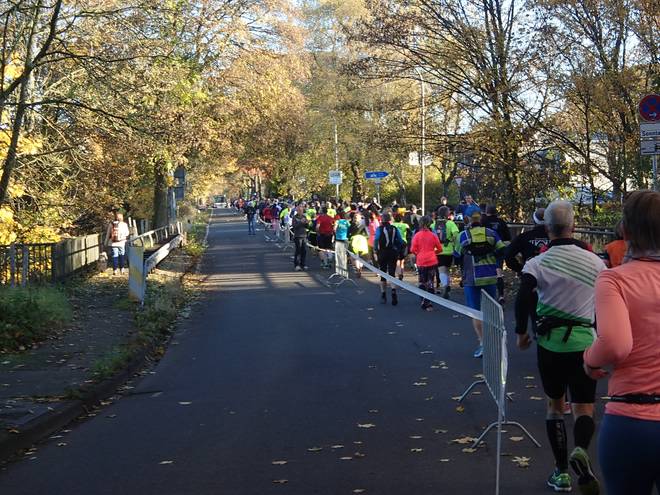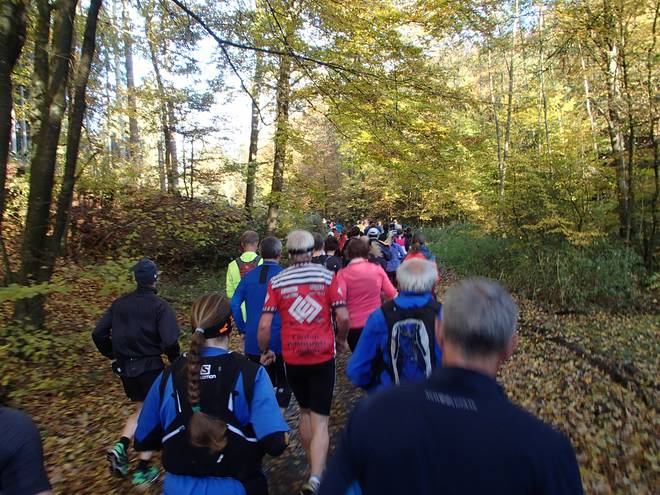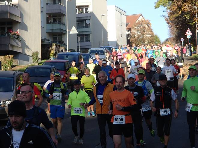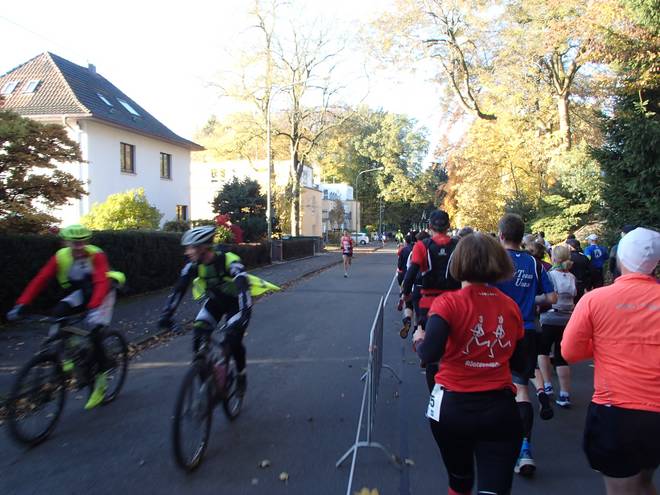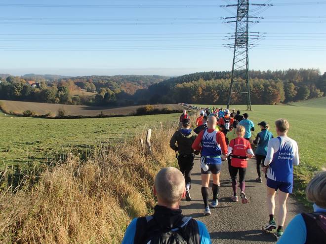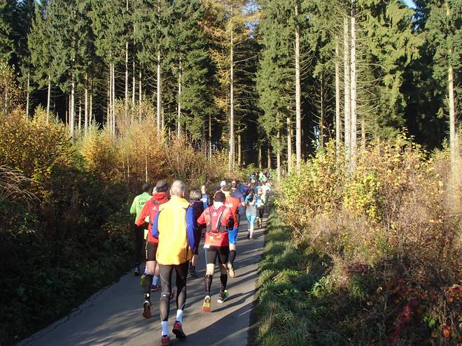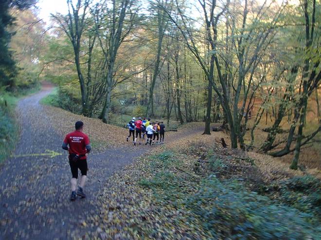 Wilhelmstaler und Haller Bachtal 9.11 Uhr / Km 6,2 Von freiem Laufen waren wir immer noch weit entfernt. Das Feld blieb dicht beisammen. |