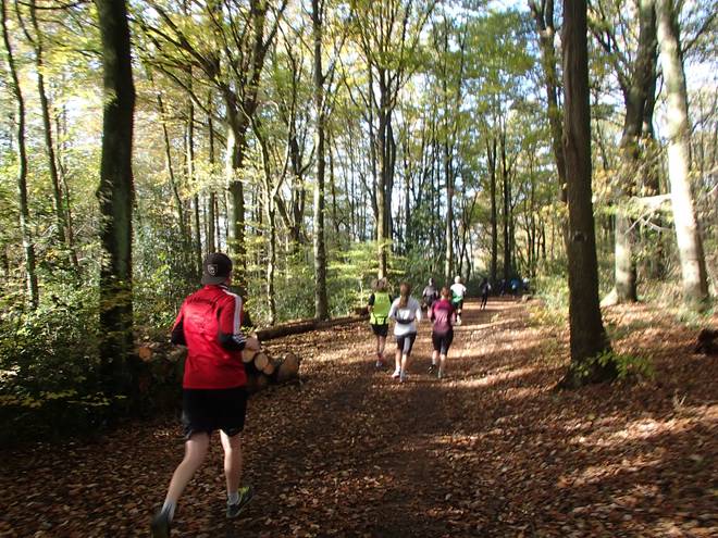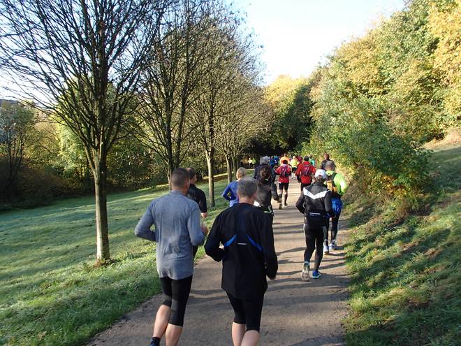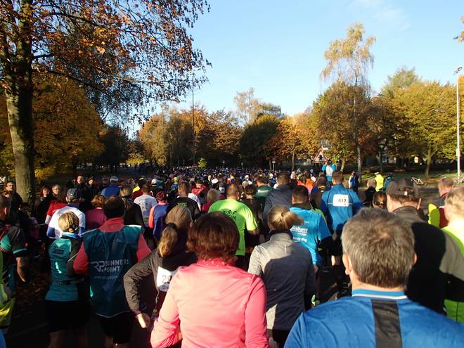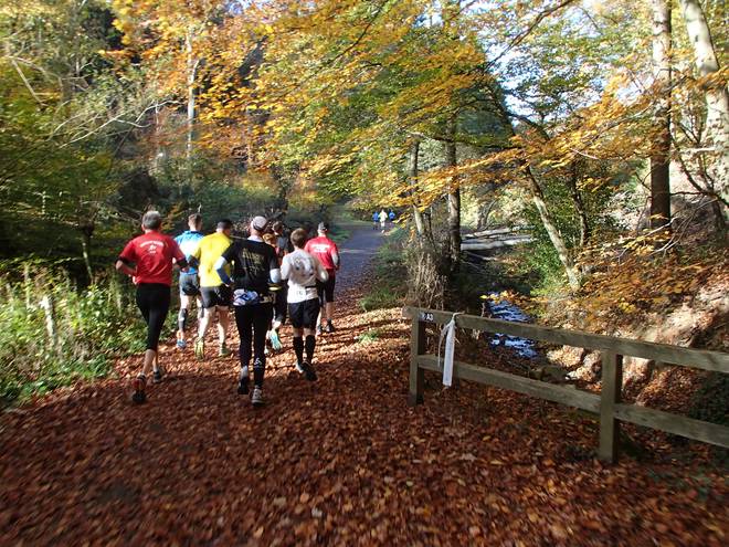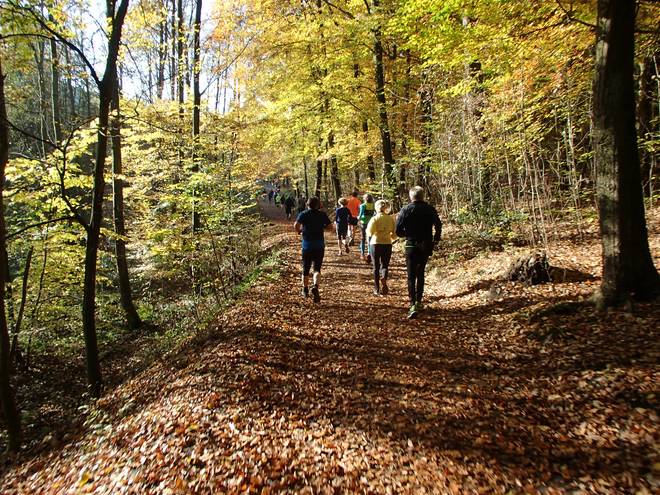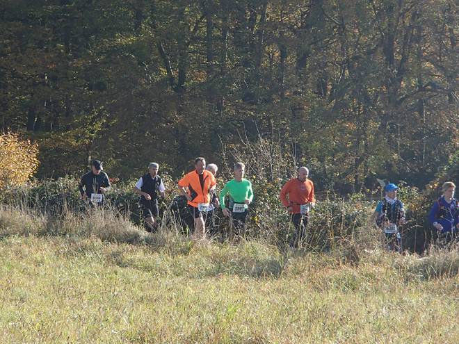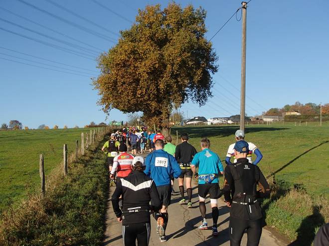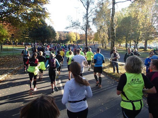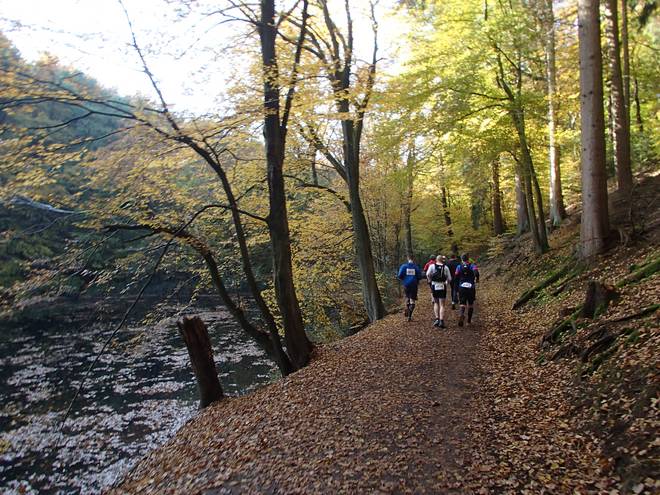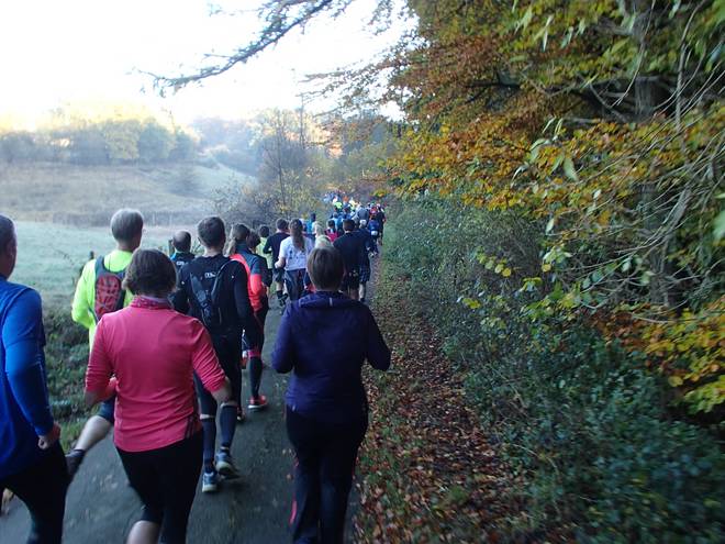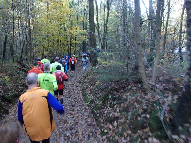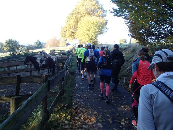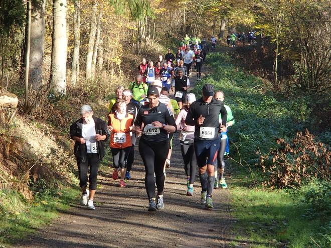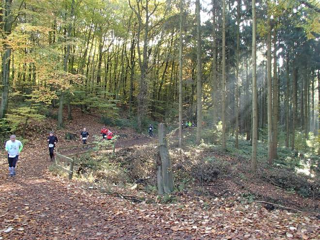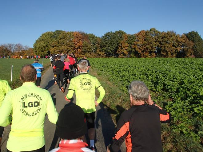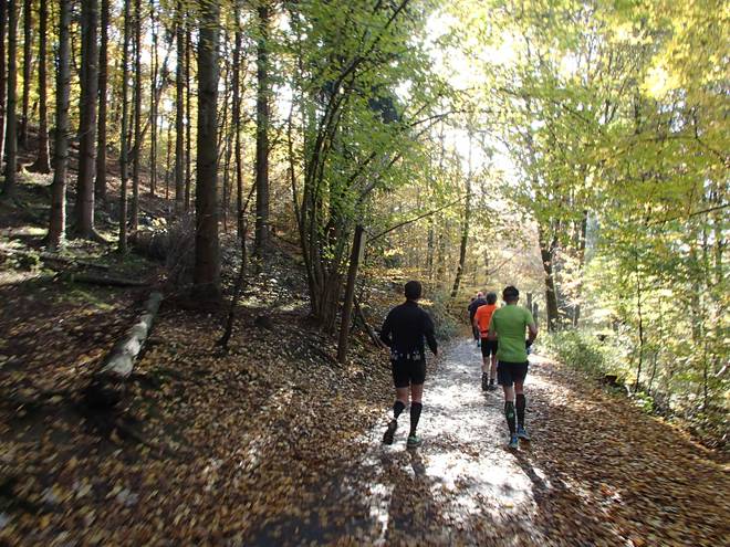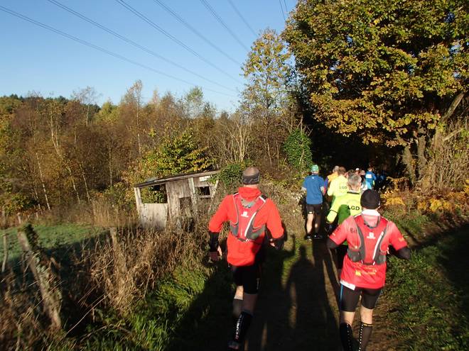 Wilhelmstaler und Haller Bachtal 9.11 Uhr / Km 6,2 Von freiem Laufen waren wir immer noch weit entfernt. Das Feld blieb dicht beisammen. |