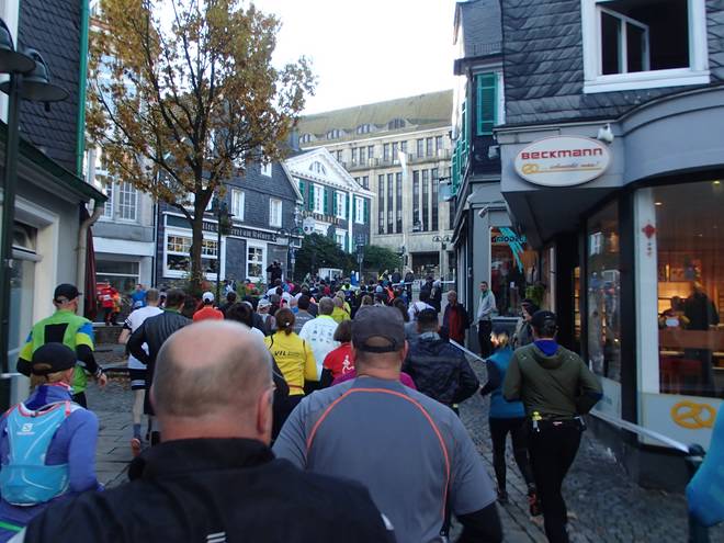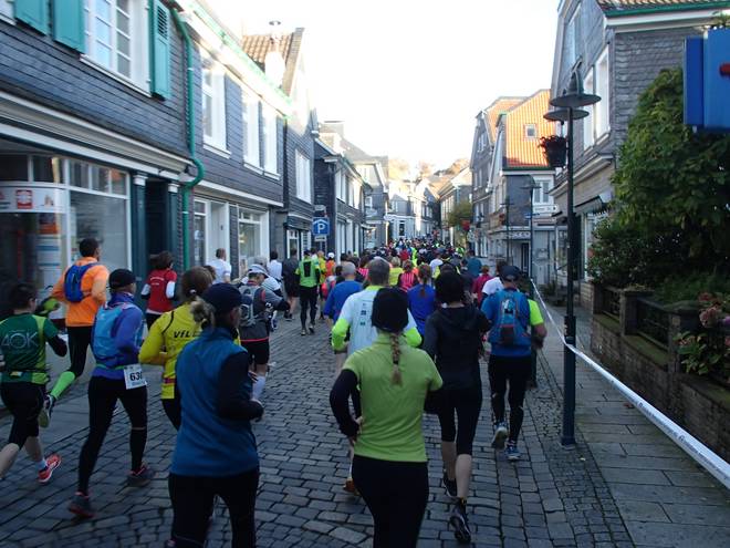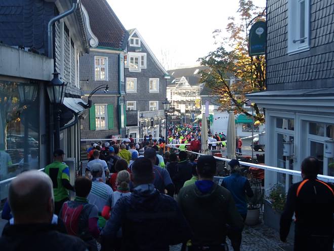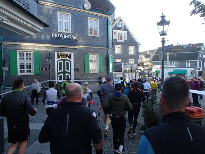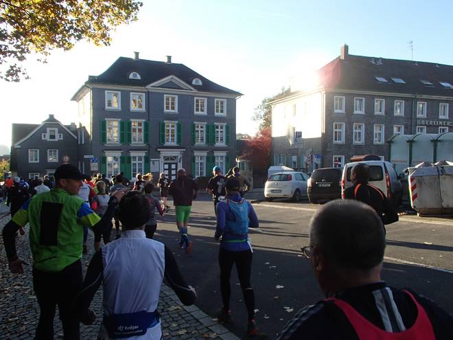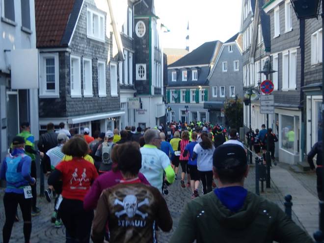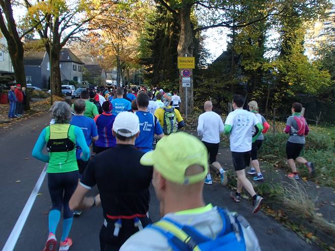 Schwelmer Straße 8.38 Uhr / Km 1,0 Und so richtig mit Laufen war hier auch nichts. Das Feld war einfach zu dicht. Naja... bei 63,3 Kilometern muß man ja auch nicht von Anfang an aufs Tempo hauen. |