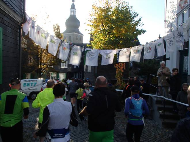 Hackenberg 9.03 Uhr / Km 5,0 Fünf Kilometer waren schon einmal geschafft. Und nun ging es (wieder bergauf) durch ein Wohnviertel raus aus dem Ort. |