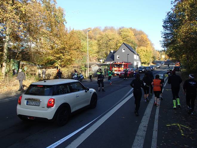 Klausener Straße Lüttringhausen 9.55 Uhr / Km 13,5 Hauptstraßen waren doch so einige zu überqueren. Aber überall war die Strecke gut abgesichert. |