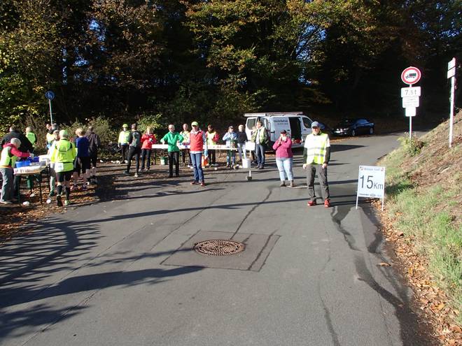 Lenhartzhammer Birgdener Berg Halbach 10.06 Uhr / Km 15,0 Verpflegungsstände gab es alle vier bis fünf Kilometer. Auf dem ersten Halbmarathon drei Stände, auf dem zweiten vier und auf dem dritten wieder nur drei Stände. Dazu natürlich je einer an den Wechselpunkten Halbmarathon und Marathon. Also 13 Verpflegungsstände auf 63,3 Kilometern. |