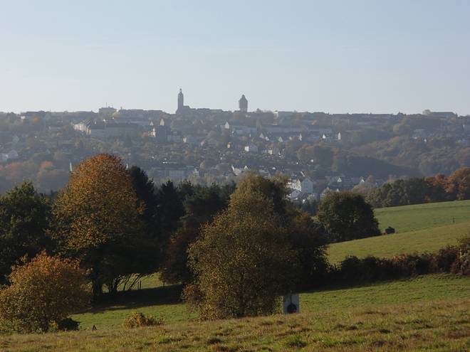 Farrenbracken 10.13 Uhr / Km 16,0 Ein schöner Blick zurück auf Lüttringhausen und den ehemaligen Wasserturm. |