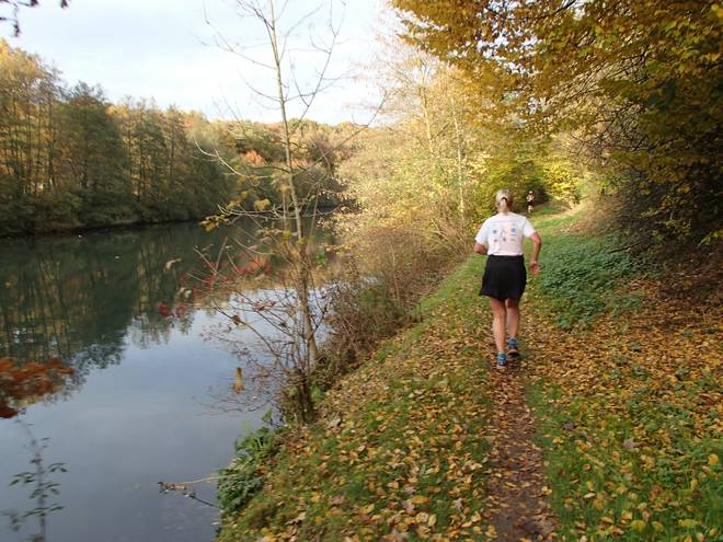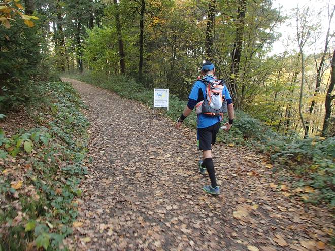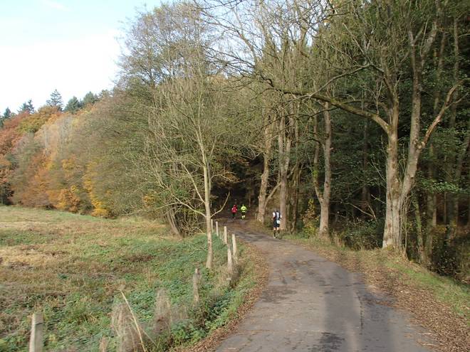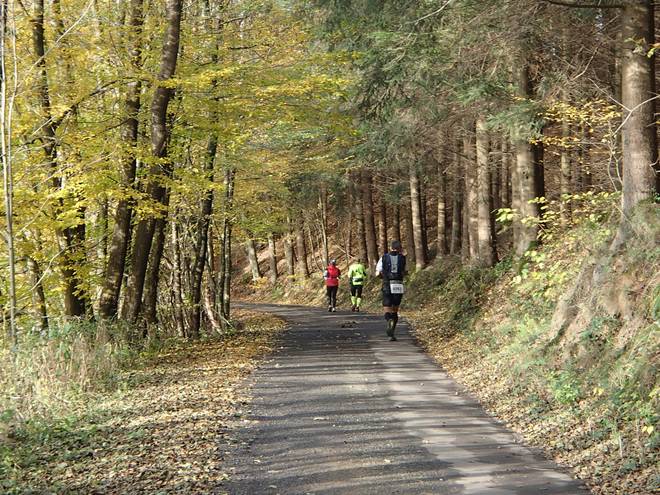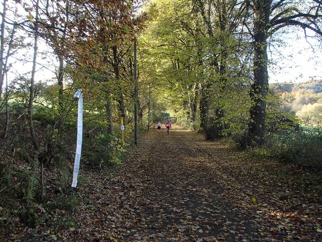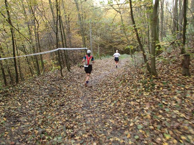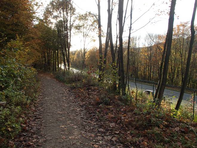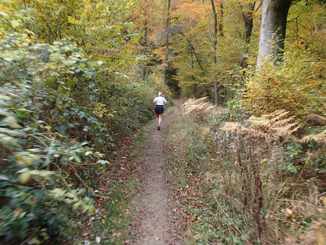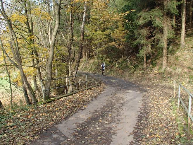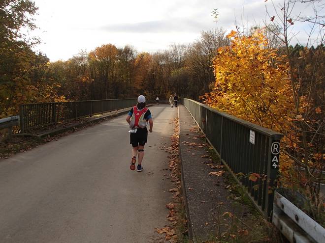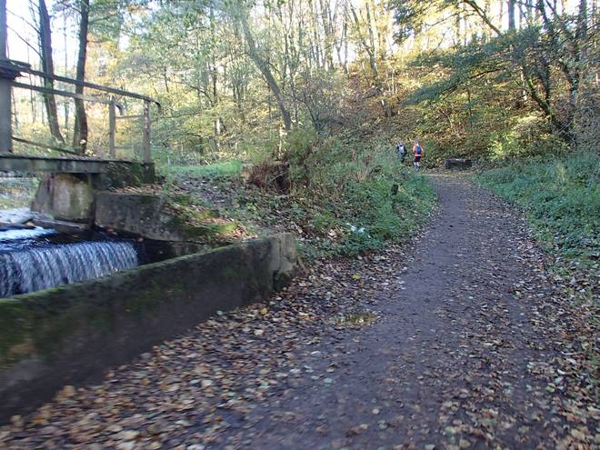 Lenneper Bach 15.42 Uhr / Km 60,0 Bergab auf Laub. Da mußte man gut aufpassen. So ganz wach war man nach mehr als sieben Stunden Laufen ja auch nicht mehr. |