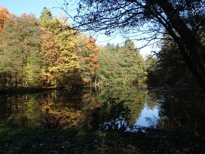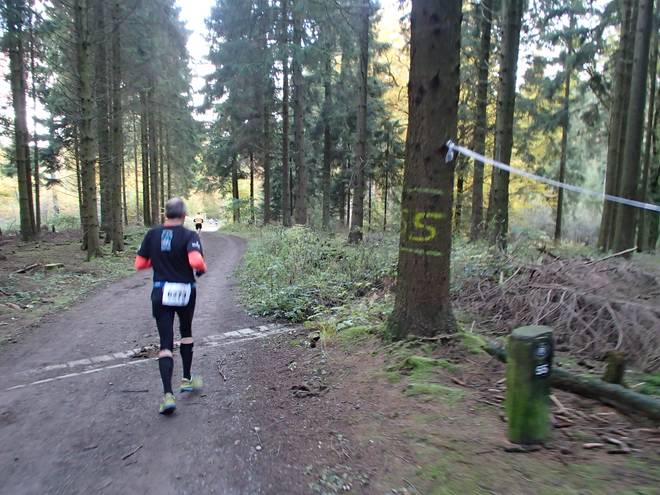 Feldbachvorsperre 15.18 Uhr / Km 57,0 Hier rechts gab es eine Menge Wasser, aber man sah es nicht. Im Wald laufen ist ja schön, aber manchmal sind es einfach zu viele Bäume. |