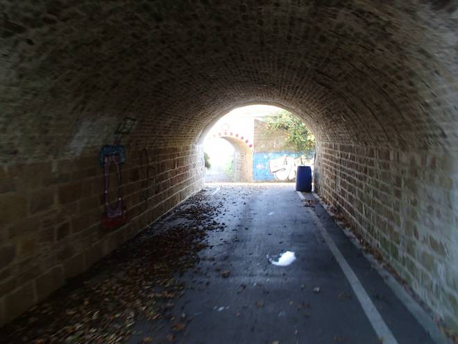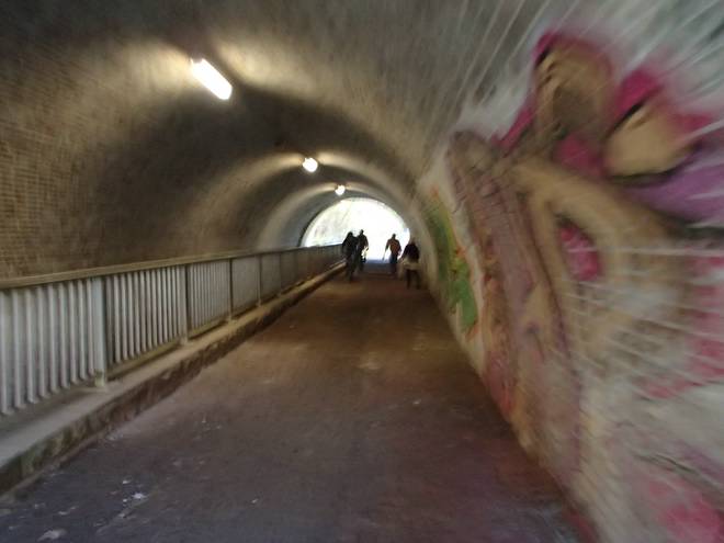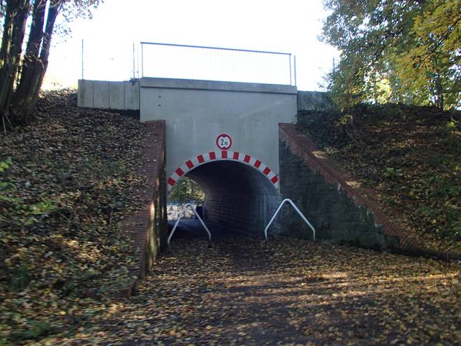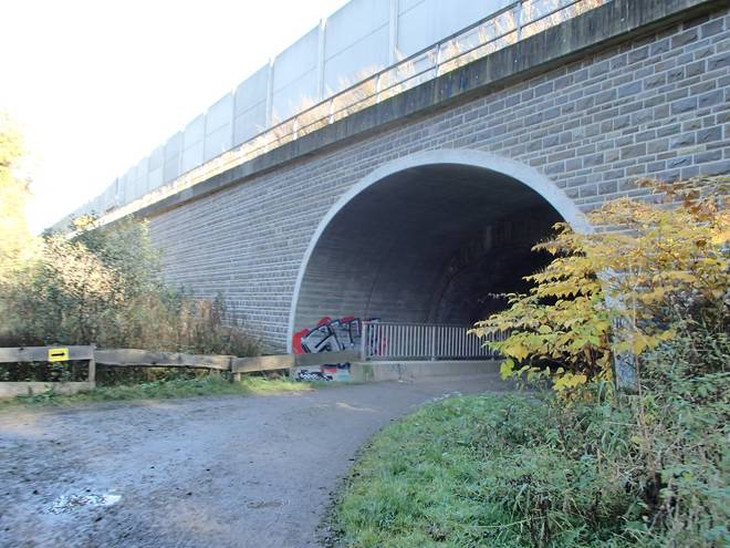 Bornbachstraße Bergisch Born 14.07 Uhr / Km 47,3 Nach dem Trinken aus den vorhandenen Bechern lief man hier unter der Balkantrasse hindurch. |