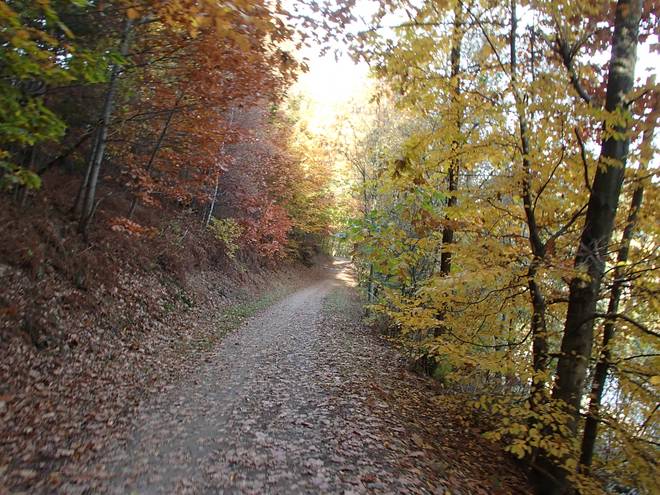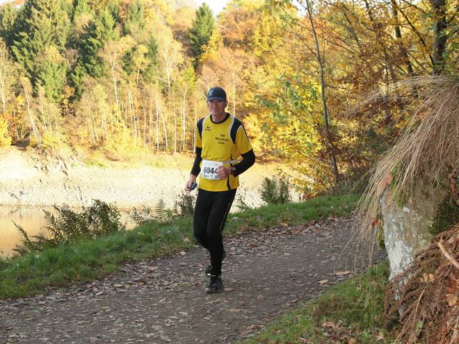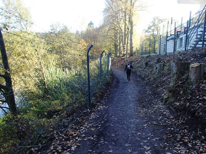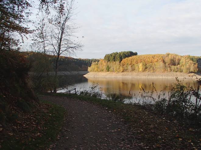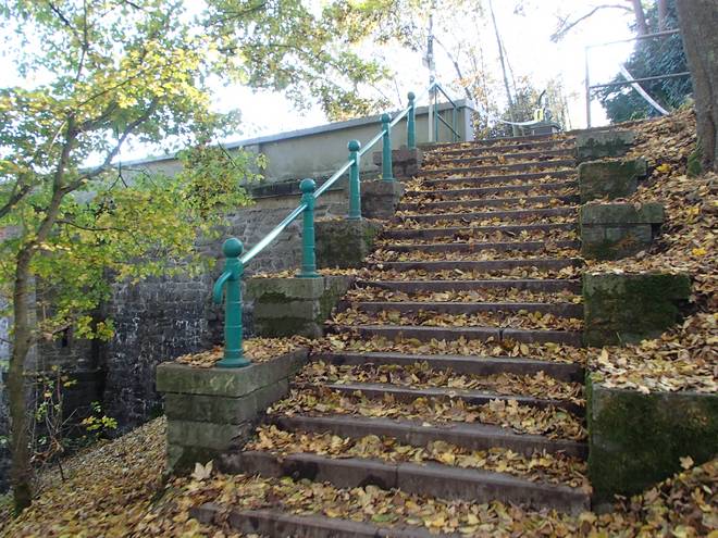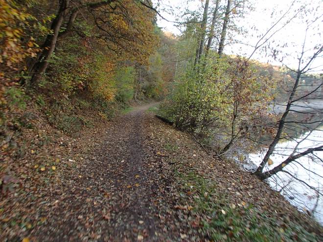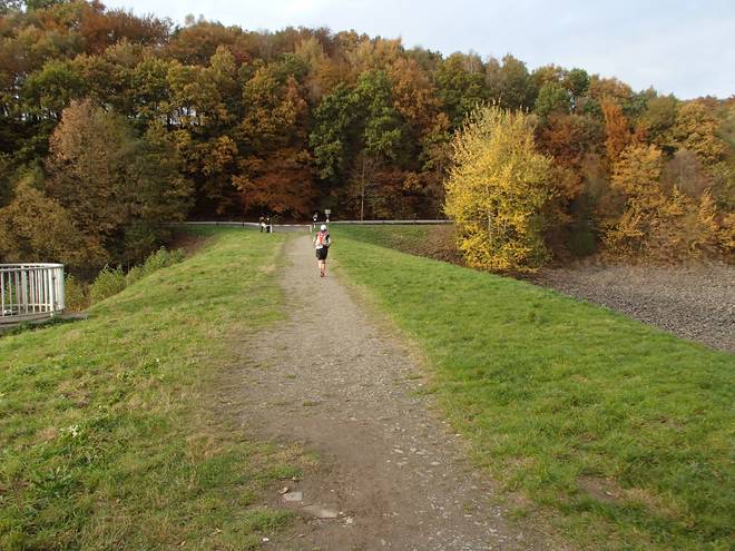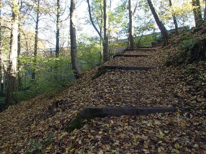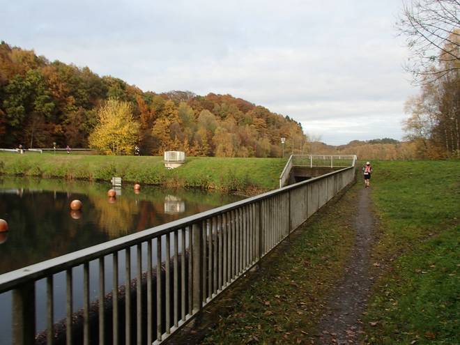 Eschbachtalsperre 13.34 Uhr / Km 43,5 ... und sogar eine Treppe. Ein wenig rutschig mit dem vielen Laub drauf. |
