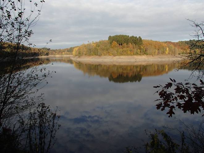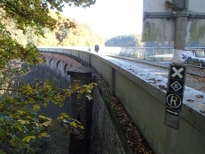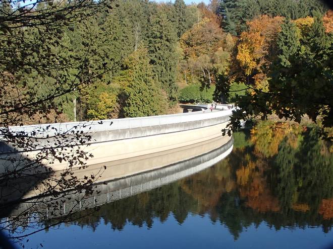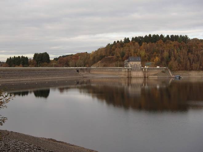 Eschbachtalsperre 13.33 Uhr / Km 43,5 Etwas hinter den Bäumen ist das Bauwerk versteckt. 20 Meter hoch, 160 Meter lang. Gebaut 1889 bis 1891 war sie Deutschlands erste reine Trinkwasser-Talsperre. |