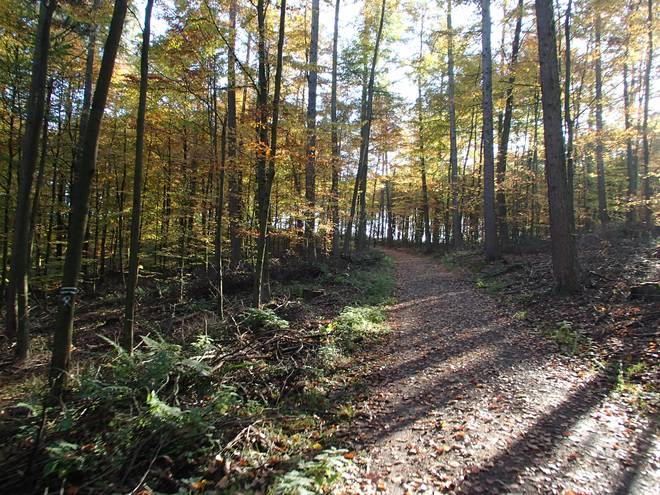 Busenberg 14.33 Uhr / Km 51,0 Die Ecke hier nervte. Es ging zu steil bergab zum Laufen, aber war irgendwie auch zu flach zum Wandern. Daher schwankte ich immer zwischen Laufen und Wandern hin und her. |