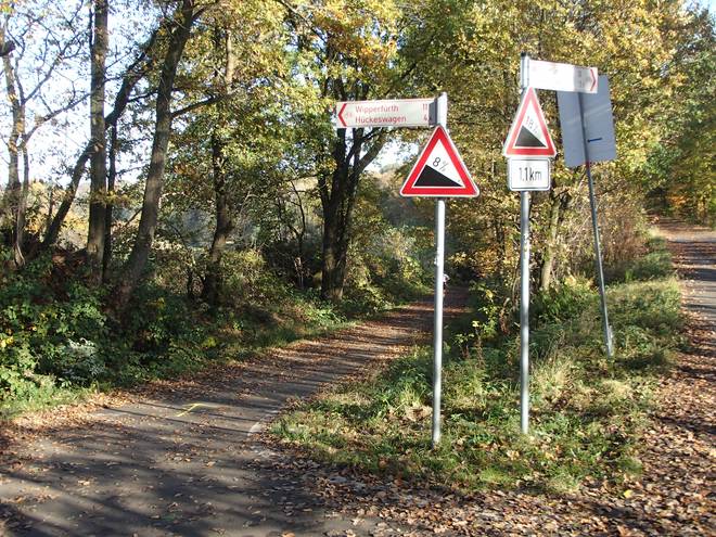 Dörpebach Huckeswagen 14.19 Uhr / Km 49,0 Ja klasse aber auch. Nach links 8% Gefälle, nach rechts 18% Gefälle. Da wäre ich doch am liebsten wieder umgekehrt. |