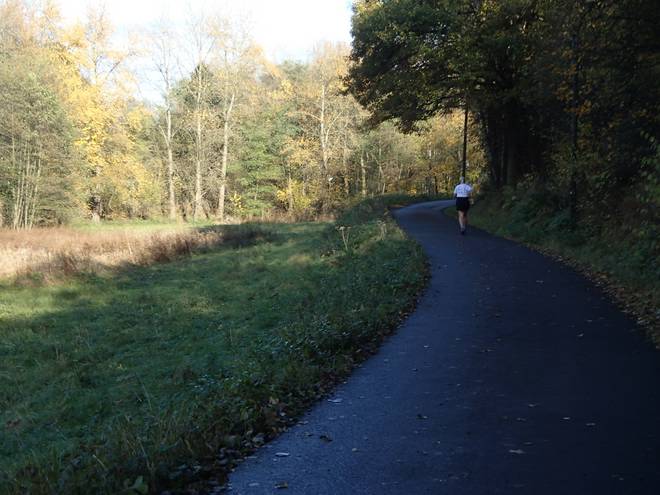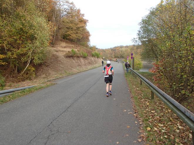 Lenneper Bach-Vorsperre 15.46 Uhr / Km 60,7 Nun fiel mir das Laufen doch wieder etwas leichter. Stück für Stück schob ich mich an die Läuferin vor mir heran. |