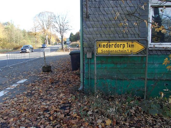 Huckeswagen B237 14.26 Uhr / Km 50,0 Wo es Sonne gibt, da gibt es auch Regen? Es liegt nahe, aber Niederdorp hat nicht die Bedeutung Regen, sondern ist einfach nur ein Ortsname. |