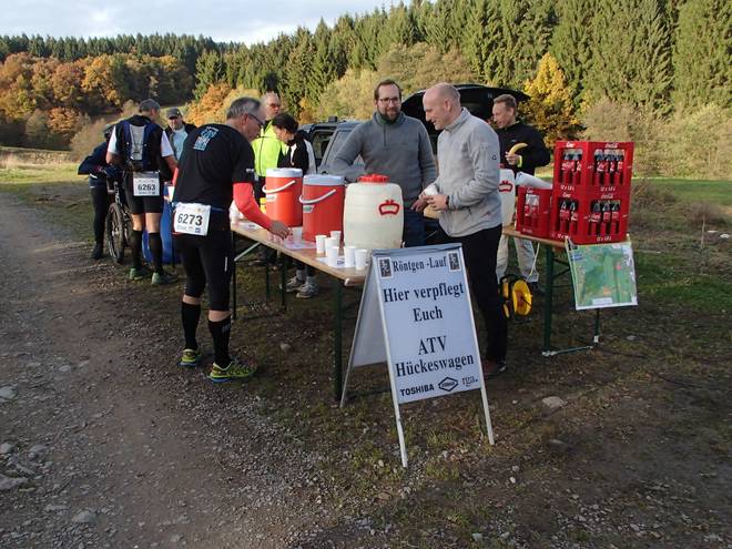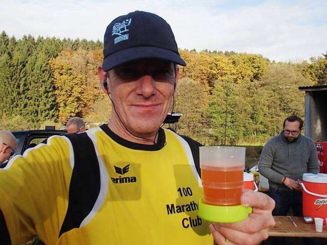 Nagelsberg 15.38 Uhr / Km 59,5 Da wartete dann aber auch der letzte Verpflegungsstand auf uns Läufer. Natürlich wieder mit Bechern ausgestattet. |