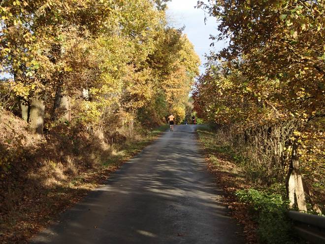 Oberstraße 13.58 Uhr / Km 46,5 Ich hatte ja gedacht, am Ende des Waldes würde es flacher, aber dem war nicht so. Und vorausgreifend kann ich sagen, daß es auch nach dem Hügel da vorne nicht flacher wurde. |