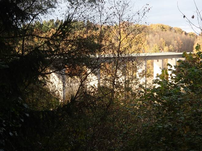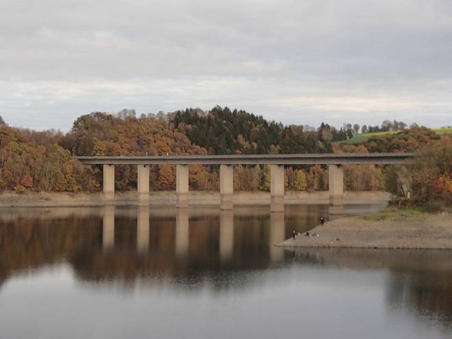 Wuppertalsperre Brücke B229 15.50 Uhr / Km 61,5 Der Brücke waren wir drei Kilometer zuvor schon sehr nahe gekommen. |