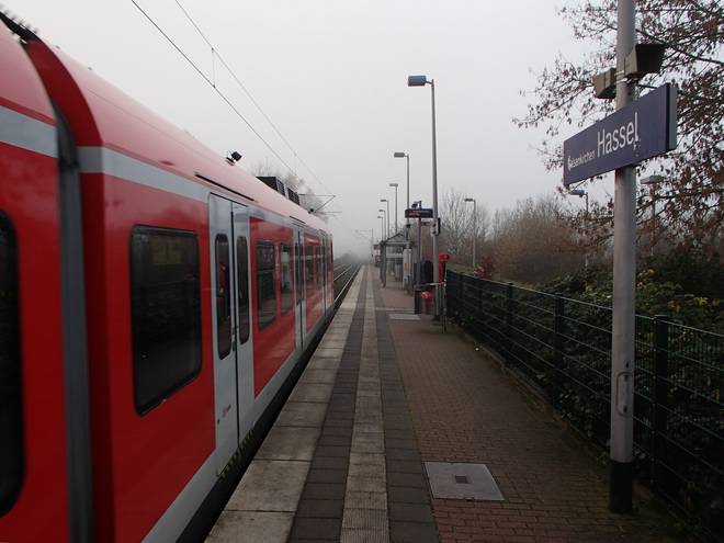 Bahnhof Gelsenkirchen-Hassel 9.13 Uhr Vom Übernachtungsort in Oberhausen ging es mit der S-Bahn nach Gelsenkirchen. Klingt seltsam, aber Bertlich (was zu Herten gehört) hat ebenso wenig einen Bahnhof wie Herten. Also fährt man nach Gelsenkirchen-Hassel und läuft über die Stadtgrenze. |