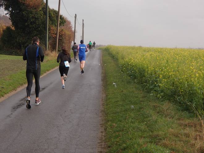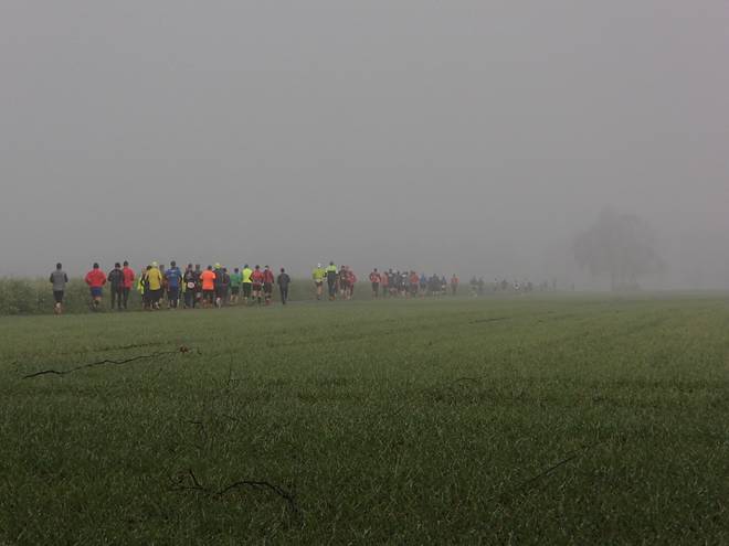 Feldweg Runde 2 11.57 Uhr / Km 15,5 Sich an dem Tempo anderer Läufer zu orientieren ist auch nicht unbedingt so clever, da auch viele Läufer anderer Distanzen im Feld sind. Hier sind fast nur Halbmarathonies und Zehn-Kilometer-Läufer im Bild. |