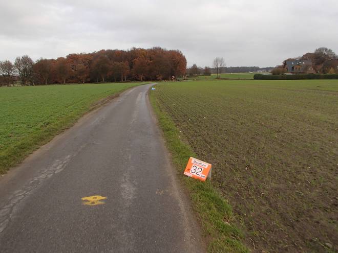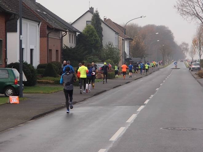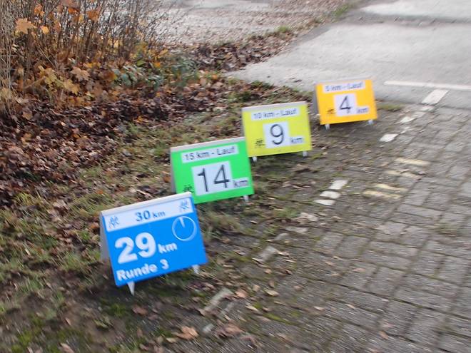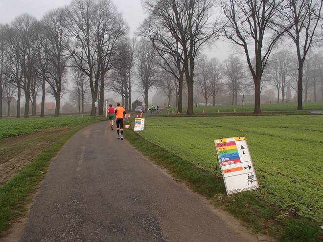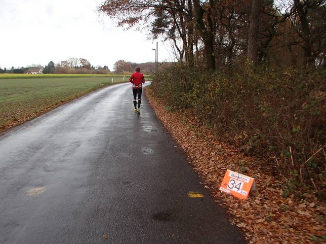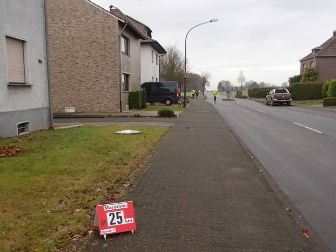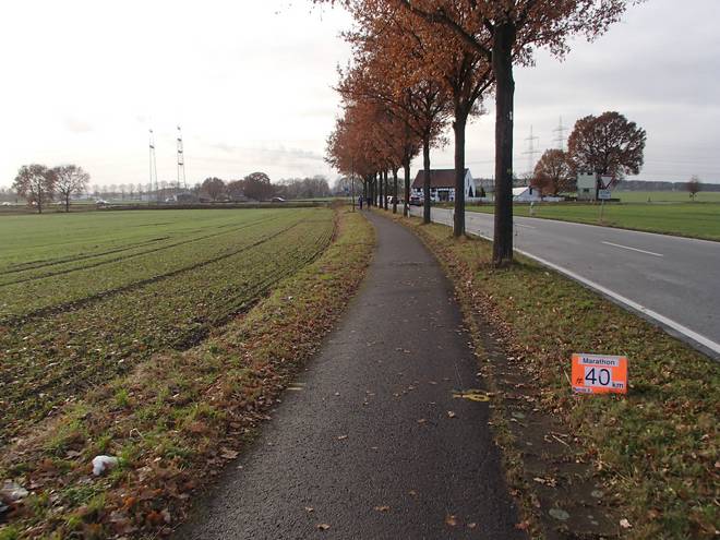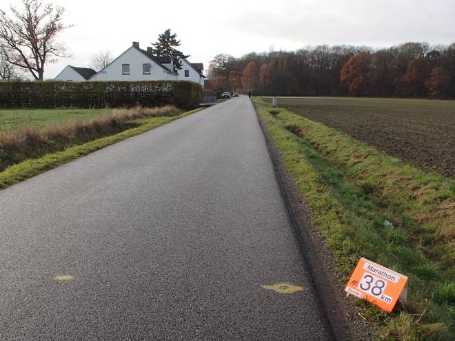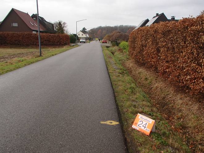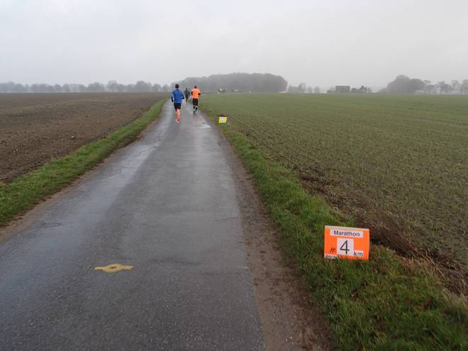 Im Opphoff Runde 1 10.53 Uhr / Km 4,0 Für jede Distanz war jeder Kilometer ausgeschildert. Und die Schilder standen gut. Beim Marathon läuft man drei Runden zu je 13,9 Kilometer. Danach folgen 500 Meter ins Ziel. |