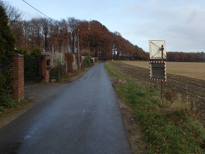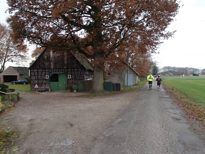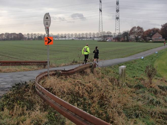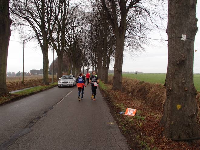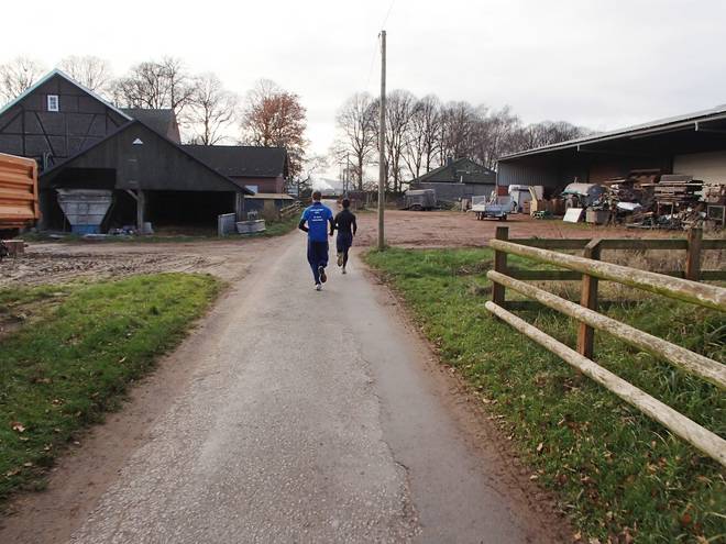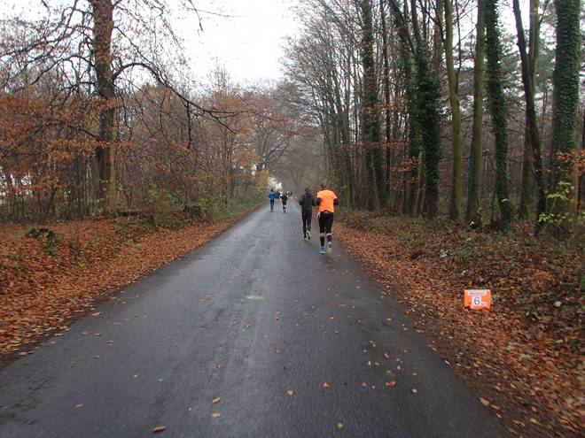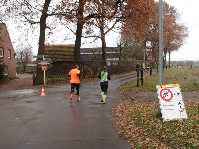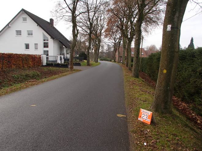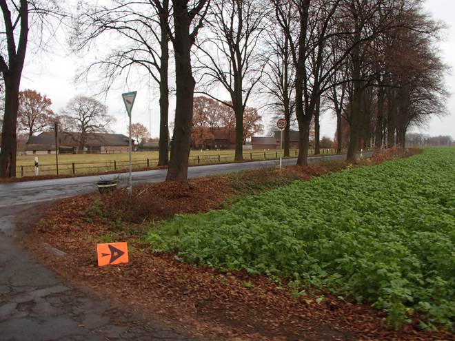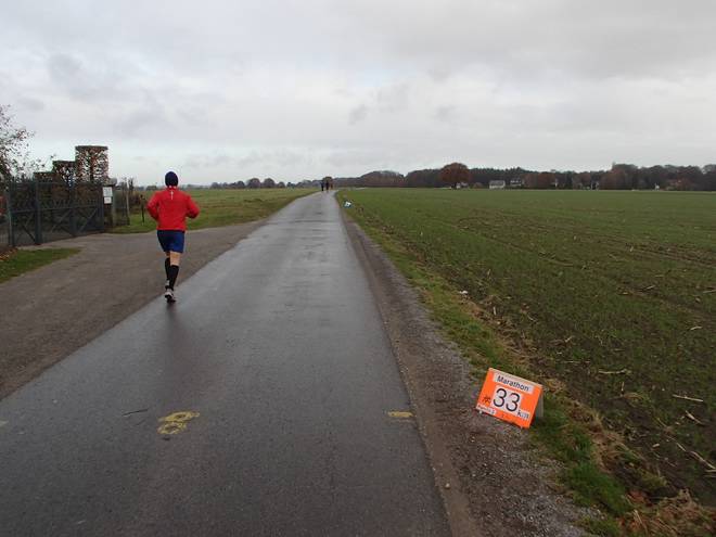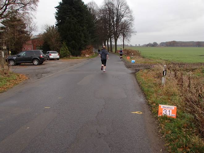Im Opphoff Runde 1 10.53 Uhr / Km 4,0 Für jede Distanz war jeder Kilometer ausgeschildert. Und die Schilder standen gut. Beim Marathon läuft man drei Runden zu je 13,9 Kilometer. Danach folgen 500 Meter ins Ziel. |