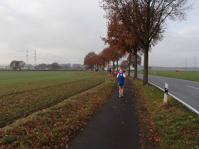 Bertlicher Straße Runde 2 11.51 Uhr / Km 14,5 Auf ging es in die zweite Runde. Und mal wieder lief ich hinter einem Läufer vom Lauf-Club Duisburg hinterher. Wie beim Monschau-Marathon und beim Röntgenlauf und natürlich beim Ruhr-Marathon in Duisburg. |