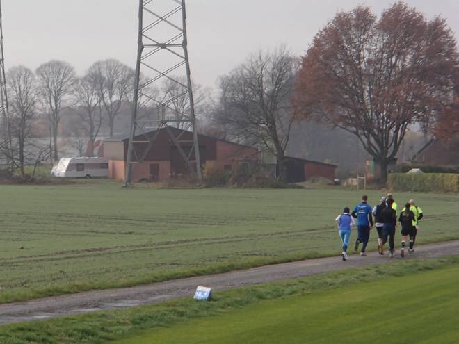 Bauernweg Runde 1 11.40 Uhr / Km 12,4 Die Vierergruppe um die Monschau-Läuferin und den Mauerläufer war inzwischen eine Sechsergruppe geworden. Zwischenzeitlich hatte ich sie komplett aus den Augen verloren. Und so nah, wie der Zoom es hier scheinen läßt, war ich nicht dran. |