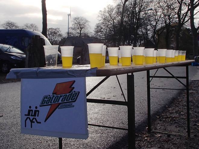 Stübbenfeldstraße Runde 1 10.59 Uhr / Km 5,0 Sechs Verpflegungsstellen gab es auf dem Marathonkurs, wobei in der Runde 1 der erste Stand gleich nach dem Start noch nicht offen war. Machte 17 Mal Verpflegung insgesamt. Plus eine im Ziel. |