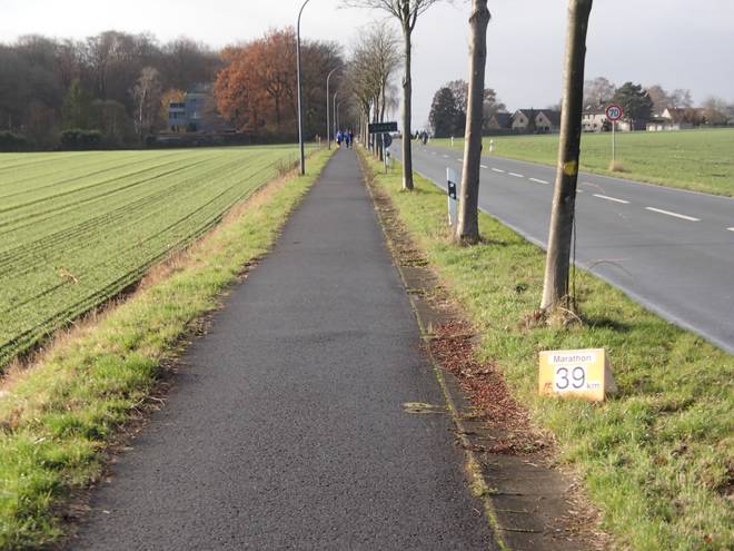 Riedstraße Runde 2 12.39 Uhr / Km 23,0 Bis ins Ziel war es noch sehr weit, also jagte ich zunächst weiter die Monschau-Läuferin. Auf langen Geraden konnte ich sie schon sehen. |