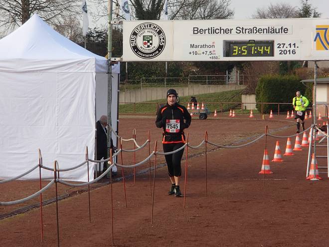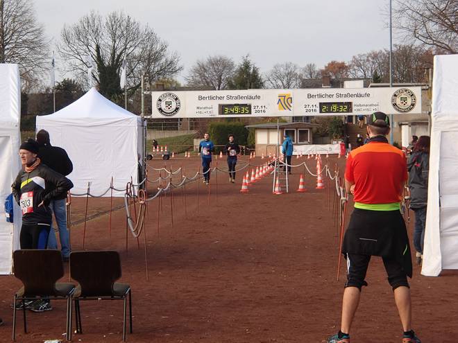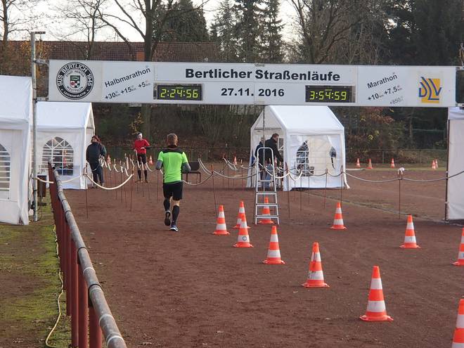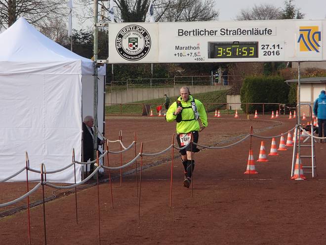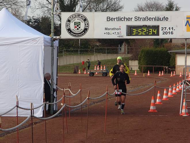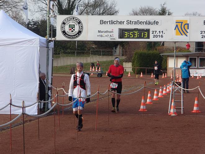 Sportplatz SuS Bertlich 1945 14.21 Uhr Und wo blieb die Monschau-Läuferin? Ihr Begleiter bis zumindest Kilometer 36 kam jedenfalls alleine ins Ziel gelaufen. |