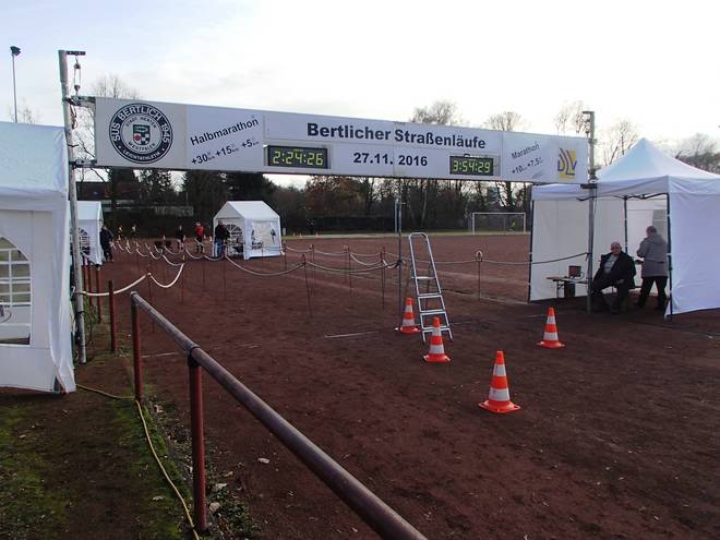 Sportplatz SuS Bertlich 1945 14.20 Uhr / Km 42,195 In dem Zelt unter dem Tor wird etwas notiert und in dem Zelt hier vorne links wird die Startnummer gescannt. Und wo erfolgt die Zeitnahme? Eigentlich egal. Auf jeden Fall hatte ich meinen Marathon geschafft. |