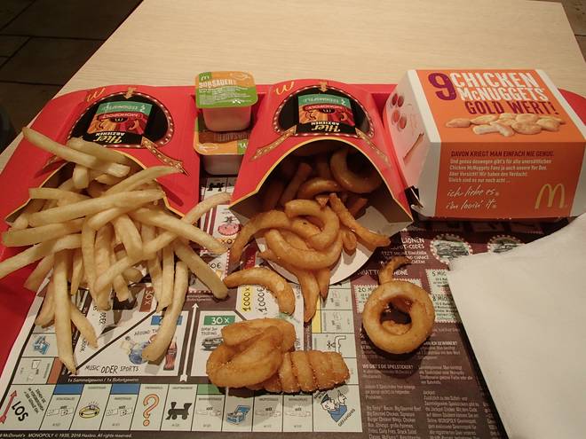 Oberhausen Hauptbahnhof 17.01 Uhr Hm. Ein McMenü mit Pommes UND Curly Fries und OHNE Getränk? Das geht tatsächlich. |