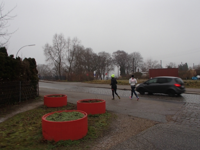 Runde 1 10.09 Uhr / Km 0,45 Zweimal je Runde war der Ausschläger Billdeich zu überqueren. Eine Sicherung gab es nicht, aber der Verkehr hielt sich in Grenzen. |